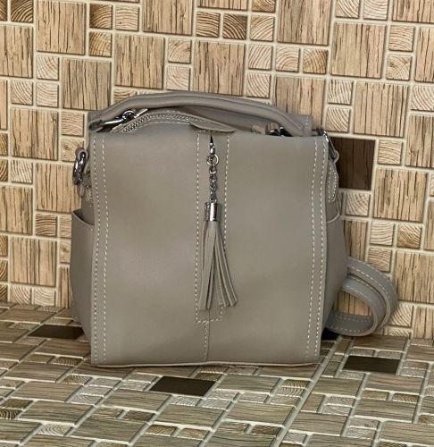 Женский рюкзак трансформер из экокожи . Закрывается клапаном и на молнию. Снаружи, на передней стенке вертикальный кармашек на молнии, на задней стенке горизонтальный карман на молнии. Внутри одно отделение и боковой кармашек. Лямки рюкзака вытягиваются в длинные ручки, что позволяет носить его через плечо как сумку. Снаружи, в верхней части, по бокам есть кнопки, которые позволяют сделать рюкзак Размеры: длина: 22см, ширина: 10см, высота 25см.